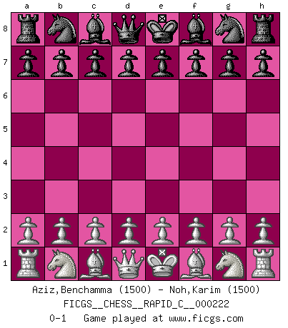 Last move : 0-1 2019 October 31 23:52:16 [Event "FICGS__CHESS__RAPID_C__000222"] [Site "FICGS"] [Date "2019.10.01"] [Round "1"] [White "Aziz,Benchamma"] [Black "Noh,Karim"] [Result "0-1"] [WhiteElo "1500"] [BlackElo "1500"] 0-1 This chess game has been lost on time (started : 2019.10.01 23:13:0) Player Black won this chess game. Follow this game move after move (download)Personally, I rather look forward to a computer program winning the world Chess Championship. Humanity needs a lesson in humility. (Richard Dawkings) Es gibt Leute, die glauben, alles wäre vernünftig, was man mit einem ernsthaften Gesicht tut. (Georg Christoph Lichtenberg) El Ajedrez es una manera fabulosa para que los niños aprendan a autovalorarse y a autoestimarse. (Saudin Robovic) Même un GMI sait rarement calculer sur plus de cinq coups une attaque à sacrifices. (Rudolf Spielmann) Luck is when opportunity knocks and you answer. (Anonymous)