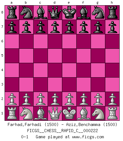 Last move : 0-1 2019 October 31 23:52:16 [Event "FICGS__CHESS__RAPID_C__000222"] [Site "FICGS"] [Date "2019.10.01"] [Round "1"] [White "Farhad,Farhadi"] [Black "Aziz,Benchamma"] [Result "0-1"] [WhiteElo "1500"] [BlackElo "1500"] 0-1 This chess game has been lost on time (started : 2019.10.01 23:13:0) Player Black won this chess game. Follow this game move after move (download)Checkers is for tramps. (Paul Morphy) Man wirke der falschen Auffassung entgegen, als ob jeder Zug Unmittelbares zu leisten habe; auch Werte- und Ruhezüge haben ihre Existenzberechtigung. (Aaron Nimzowitsch) En el Ajedrez, cuando menos, el valiente hereda la tierra. (Edmar Mednis) Psychologiquement, tu dois avoir confiance en toi même, mais cette confiance doit être basée sur des faits. (Robert Fischer) Kids, you tried your best and you failed miserably. The lesson is, never try. (Simpsons)