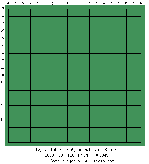 Last move : 0-1 2019 November 3 9:7:28 [Event "FICGS__GO__TOURNAMENT__000049"] [Site "FICGS"] [Date "2019.10.03"] [Round "1"] [Black "Quyet,Dinh"] [White "Agronow,Cosmo"] [Result "0-1"] [Rating 2 "0862"] 0-1 This go game has been lost on time (started : 2019.10.03 22:46:26) Here are the names of the openings (joseki) played in the four corners : Player White won this Go (weiqi, baduk) game. Follow this game move after move (download)Beware of the clumsy double contact. (Anonymous) Chess is as much a mystery as women. (Purdy)