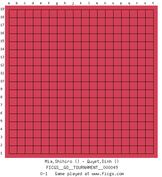 Last move : 0-1 2019 November 3 9:7:28 [Event "FICGS__GO__TOURNAMENT__000049"] [Site "FICGS"] [Date "2019.10.03"] [Round "1"] [Black "Mia,Shihiro"] [White "Quyet,Dinh"] [Result "0-1"] 0-1 This go game has been lost on time (started : 2019.10.03 22:46:26) Here are the names of the openings (joseki) played in the four corners : Player White won this Go (weiqi, baduk) game. Follow this game move after move (download)One point in the center is worth ten in the corner. (Anonymous) Nowadays, anyone who cannot speak English and is incapable of using the Internet is regarded as backward. (Al-Waleed bin Talal)