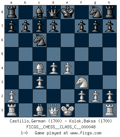 Last move : 1-0 2007 August 8 2:37:59 [Event "FICGS__CHESS__CLASS_C__000048"] [Site "FICGS"] [Date "2007.06.26"] [Round "1"] [White "Castillo,German"] [Black "Kolok,Baksa"] [Result "1-0"] [WhiteElo "1700"] [BlackElo "1700"] 1.d4 Nc6 2.e4 e5 3.Nf3 exd4 4.Bc4 Bb4+ 5.c3 Bc5 6.cxd4 Bb4+ 7.Nc3 Bxc3+ 8.bxc3 1-0 This chess game has been lost on time (started : 2007.06.26 12:55:44) Queen's pawn : Lundin (Kevitz-Mikenas) defense Player White won this chess game. Follow this game move after move (download)We must make sure that Chess will not be like a dead language, very interesting, but for a very small group. (Sytze Faber) Je mehr wir mit Computern analysieren, desto mehr glauben wir an Verteidigung. (Vladimir Kramnik) Un entendimiento minucioso de las típicas continuaciones de mate hacen de las mas complicadas combinaciones de sacrificio que conducen hacia ellas no solo no dificiles, sino casi un asunto de rutina. (Siegbert Tarrasch) Plusieurs personnes se sont demandées comment Tal faisait pour gagner... En fait, c'est très simple ! Il met ses pièces au centre de l'échiquier et les sacrifie quelque part ! (David Bronstein) Work expands to fill the time available. (C. Northcote Parkinson, in Parkinson's Laws)