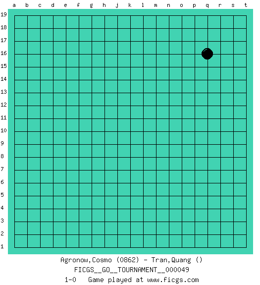 Last move : 1-0 2019 November 3 9:7:28 [Event "FICGS__GO__TOURNAMENT__000049"] [Site "FICGS"] [Date "2019.10.03"] [Round "1"] [Black "Agronow,Cosmo"] [White "Tran,Quang"] [Result "1-0"] [Rating 1 "0862"] 1.q16 1-0 This go game has been lost on time (started : 2019.10.03 22:46:26) Here are the names of the openings (joseki) played in the four corners : Player Black won this Go (weiqi, baduk) game. Follow this game move after move (download)There are players who don't accept exchange: they play many moves that perpetuate a previous state of the game. (Pierre Audouard) I can't decide which is riskier; taking crazy risks, or taking advice on crazy risks from a crazy risk taker. (Gregory House in House M.D.)