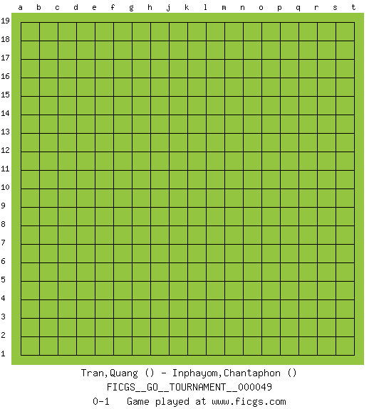 Last move : 0-1 2019 November 3 9:7:28 [Event "FICGS__GO__TOURNAMENT__000049"] [Site "FICGS"] [Date "2019.10.03"] [Round "1"] [Black "Tran,Quang"] [White "Inphayom,Chantaphon"] [Result "0-1"] 0-1 This go game has been lost on time (started : 2019.10.03 22:46:26) Here are the names of the openings (joseki) played in the four corners : Player White won this Go (weiqi, baduk) game. Follow this game move after move (download)Go uses the most elemental materials and concepts - line and circle, wood and stone, black and white - combining them with simple rules to generate subtle strategies and complex tactics that stagger the imagination. (Iwamoto Kaoru, 9 dan professional Go player and former Honinbo title holder) At work, the authority of a person is inversely proportional to the number of pens that person is carrying. (Dan Rotaru)