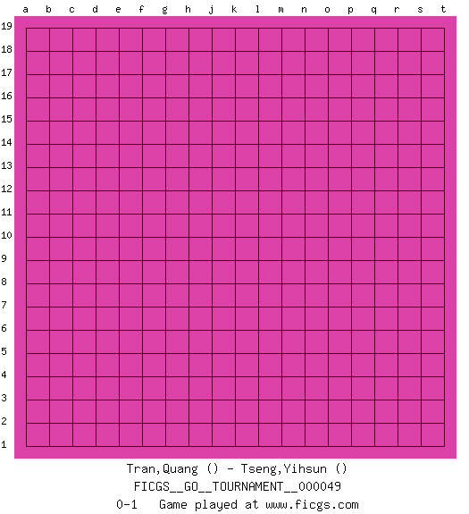 Last move : 0-1 2019 November 3 9:7:28 [Event "FICGS__GO__TOURNAMENT__000049"] [Site "FICGS"] [Date "2019.10.03"] [Round "1"] [Black "Tran,Quang"] [White "Tseng,Yihsun"] [Result "0-1"] 0-1 This go game has been lost on time (started : 2019.10.03 22:46:26) Here are the names of the openings (joseki) played in the four corners : Player White won this Go (weiqi, baduk) game. Follow this game move after move (download)Error is one of the sources of transformation. (Pierre Audouard) Gambling : The sure way of getting nothing from something. (Wilson Mizner)