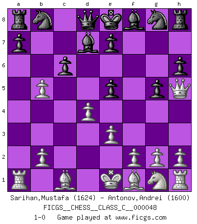 Last move : 1-0 2007 September 8 20:51:6 [Event "FICGS__CHESS__CLASS_C__000048"] [Site "FICGS"] [Date "2007.06.26"] [Round "1"] [White "Sarihan,Mustafa"] [Black "Antonov,Andrei"] [Result "1-0"] [WhiteElo "1624"] [BlackElo "1600"] 1.d4 d5 2.c4 dxc4 3.e3 Be6 4.Na3 c6 5.Nxc4 b5 6.Ne5 f6 7.Nef3 h6 8.a4 g5 9.axb5 Bd7 10.Ne5 fxe5 11.Qh5+ 1-0 Queen's gambit accepted Player White won this chess game. Follow this game move after move (download)Of Chess it has been said that life is not long enough for it, but that is the fault of life, not Chess. (William Ewart Napier) Man braucht nicht immer den besten Zug zu spielen: Ein Zug muß aktiv, unternehmungslustig, korrekt und schön sein. (David Bronstein) Ciertamente el estado mental actual de Bobby Fischer es una tragedia. Uno de los mas grandes jugadores de Ajedrez del mundo -el orgullo y pena del Ajedrez Americano. (Frank Brady) Les échecs sont un jeu terrible. Si vous n'avez pas le centre, votre adversaire a une position plus libre. Par contre, si vous avez le centre, alors vous avez vraiment quelque chose pour laquelle vous inquiéter ! (Siegbert Tarrasch) Tree pose grows confidence. It roots me to this world. (Terri Guillemets)