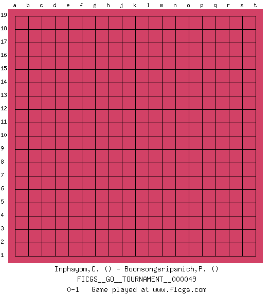 Last move : 0-1 2019 November 3 9:7:28 [Event "FICGS__GO__TOURNAMENT__000049"] [Site "FICGS"] [Date "2019.10.03"] [Round "1"] [Black "Inphayom,Chantaphon"] [White "Boonsongsripanich,Pattareya"] [Result "0-1"] 0-1 This go game has been lost on time (started : 2019.10.03 22:46:26) Here are the names of the openings (joseki) played in the four corners : Player White won this Go (weiqi, baduk) game. Follow this game move after move (download)Very few good moves are played. (Pierre Audouard) All war is based on deception. (Sun Tzu)