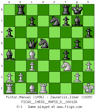 Last move : 0-1 2019 October 15 18:50:19 [Event "FICGS__CHESS__RAPID_D__000126"] [Site "FICGS"] [Date "2019.10.05"] [Round "1"] [White "Pintor,Manuel"] [Black "Zaunercik,Ilmar"] [Result "0-1"] [WhiteElo "1496"] [BlackElo "1439"] 1.e4 e5 2.f4 exf4 3.Nf3 g5 4.Bc4 Bg7 5.d4 d6 6.O-O Nc6 7.c3 h6 8.h3 Nf6 9.e5 dxe5 10.d5 Ne7 11.Qa4+ Bd7 12.Qb3 O-O 13.Nxe5 Be8 14.Rd1 Qd6 15.Nd2 Qxe5 16.Nf3 Qd6 17.Nd4 a6 18.Qxb7 Bd7 19.Qb3 Nfxd5 20.Nf3 Qc5+ 21.Kh1 Rab8 22.Qa4 Bxa4 0-1 King's knight's gambit Kingside Castling by player White (move 6) Kingside Castling by player Black (move 12) Player Black won this chess game. Follow this game move after move (download)The way he plays Chess demonstrates a man's whole nature. (Stanley Ellin) Im Schach gewinnt jeder. Hat man Freunde am Spiel - und das ist die Hauptsache - ist auch der Verlust einer Partie kein Unglück. (David Bronstein) Fischer no está bajo la obligación de nadie. (Joseph Platz) Le succès, c'est être capable d'aller d'échec en échec sans perdre son enthousiasme. (Winston Churchill) He who fights with monsters should be careful lest he thereby become a monster. (Friedrich Nietzsche, Beyond Good and Evil)