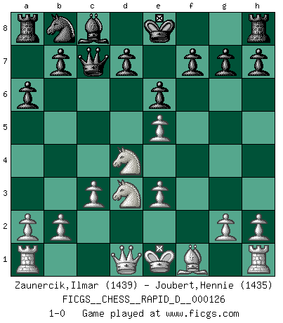 Last move : 1-0 2019 October 15 13:14:28 [Event "FICGS__CHESS__RAPID_D__000126"] [Site "FICGS"] [Date "2019.10.05"] [Round "1"] [White "Zaunercik,Ilmar"] [Black "Joubert,Hennie"] [Result "1-0"] [WhiteElo "1439"] [BlackElo "1435"] 1.e4 c5 2.Nf3 e6 3.d4 cxd4 4.Nxd4 Nf6 5.Nc3 Qb6 6.e5 Bc5 7.Be3 Nd5 8.Na4 Qa5+ 9.c3 Nxe3 10.fxe3 Qc7 11.Nxc5 a6 12.Nd3 1-0 Sicilian : Anderssen variation Player White won this chess game. Follow this game move after move (download)We must make sure that Chess will not be like a dead language, very interesting, but for a very small group. (Sytze Faber) Wenn ich einen Club besuche, sind die Spieler stumm vor Staunen. (José Raúl Capablanca) Cuando le juegas a Fischer, no es una cuestion de si vas a ganar o perder. Es una cuestion de si vas a sobrevivir. (Boris Spassky) Les échecs c'est le défi de l'alpiniste, toujours plus haut, prêt à tout pour monter à l'assaut du Roi ennemi. Les échecs, c'est de la musique en mouvement, un ballet majestueux pour les yeux. C'est de la poésie composée par les fantômes du passé qui au même titre que Rimbaud ou Verlaine méritent notre admiration. Les échecs, c'est de la peinture ou le moindre mouvement modifie le tableau pour en faire un Picasso ou un Van Gogh. Les échecs, c'est tout et rien, c'est la vie et la mort. Jjulie33 sur le forum de France-Echecs. Treat your password like your toothbrush. Don't let anybody else use it, and get a new one every six months. (Clifford Stoll)