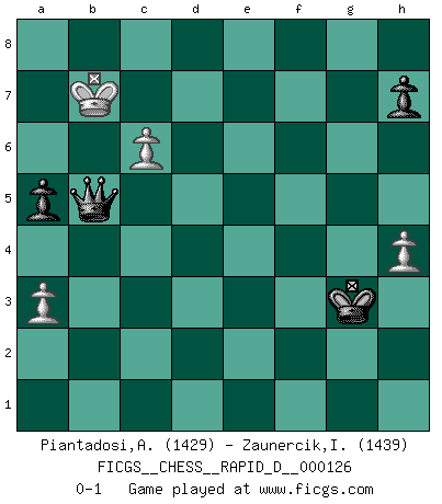 Last move : 0-1 2019 December 17 0:37:16 [Event "FICGS__CHESS__RAPID_D__000126"] [Site "FICGS"] [Date "2019.10.05"] [Round "1"] [White "Piantadosi,Angelo"] [Black "Zaunercik,Ilmar"] [Result "0-1"] [WhiteElo "1429"] [BlackElo "1439"] 1.e4 e5 2.Nf3 Nc6 3.Bb5 a6 4.Bxc6 dxc6 5.O-O Bd6 6.d4 exd4 7.Nxd4 Nf6 8.Nc3 O-O 9.f3 Bc5 10.Be3 Re8 11.Nf5 Bxe3+ 12.Nxe3 Be6 13.Qxd8 Raxd8 14.Rad1 b5 15.Rxd8 Rxd8 16.Rd1 Rxd1+ 17.Nexd1 Kf8 18.Ne3 Ke7 19.Kf2 Kd6 20.f4 Ng4+ 21.Nxg4 Bxg4 22.h3 Be6 23.a3 Kc5 24.Ke3 f6 25.g4 a5 26.Ne2 Kd6 27.Nd4 Bc8 28.Nf5+ Bxf5 29.exf5 Kd5 30.b3 c5 31.Kd3 c4+ 32.bxc4+ bxc4+ 33.Kc3 Kc5 34.g5 Kd5 35.gxf6 gxf6 36.Kd2 Ke4 37.Kc3 Kxf4 38.Kxc4 Kxf5 39.Kd5 Kf4 40.c4 f5 41.Kc6 Kg3 42.Kxc7 f4 43.c5 f3 44.Kb7 f2 45.c6 f1Q 46.h4 Qb5+ 0-1 Ruy Lopez : Exchange variation, 5.O-O Kingside Castling by player White (move 5) Kingside Castling by player Black (move 8) 10 pieces endgame at move 38 : White KPPPP , Black KPPPP WHITE : King + 4 Pawns BLACK : King + 4 Pawns 9 pieces endgame at move 38 : White KPPP , Black KPPPP WHITE : King + 3 Pawns BLACK : King + 4 Pawns 8 pieces endgame at move 42 : White KPPP , Black KPPP WHITE : King + 3 Pawns BLACK : King + 3 Pawns Promotion Queen by player Black (move 45) Player Black won this chess game. Follow this game move after move (download)Fischer is an American Chess tragedy on par with Morphy and Pillsbury. (Mig Greengard) Was ist der Unterschied zwischen einem Strassenarbeiter und einem Schachspieler? --Der Schachspieler bewegt sich ab und zu. (Anonymous) La belleza de un movimiento no se refleja solo en su apariencia, sino en el pensamiento detrás de él. (Siegbert Tarrasch) Les Echecs sont et restent toujours un combat, un combat intégral comme la boxe, la lutte ou un autre sport, et où il doit y avoir un vainqueur et un vaincu. (Joseph Emil Diemer) 'preceded by its own quotation yields a falsehood' preceded by its own quotation yields a falsehood. (W. V. O. Quine - Set Theory And Its Logic, 1953)