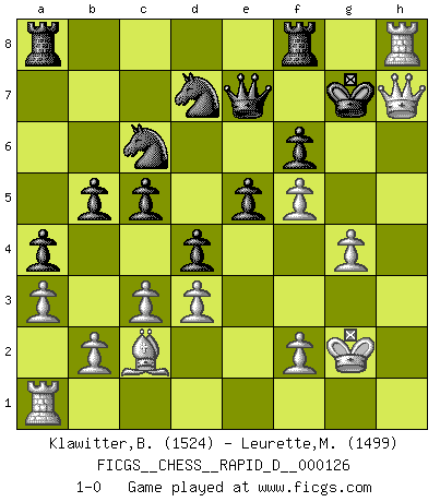 Last move : 1-0 2019 October 27 8:35:49 [Event "FICGS__CHESS__RAPID_D__000126"] [Site "FICGS"] [Date "2019.10.05"] [Round "1"] [White "Klawitter,Bernd"] [Black "Leurette,Marc-Antoine"] [Result "1-0"] [WhiteElo "1524"] [BlackElo "1499"] 1.e4 e5 2.Nf3 Nc6 3.Bb5 d6 4.d3 Bd7 5.c3 a6 6.Ba4 b5 7.Bc2 Nf6 8.O-O Be7 9.h3 O-O 10.Re1 Re8 11.Nbd2 a5 12.Nf1 h6 13.Ne3 a4 14.a3 Na5 15.Bd2 c5 16.Nf5 Bxf5 17.exf5 Nc6 18.g4 Nd7 19.Kg2 Bf6 20.Rh1 d5 21.Re1 d4 22.h4 Bxh4 23.Nxh4 Qxh4 24.Rh1 Qe7 25.Bxh6 gxh6 26.Rxh6 f6 27.Qh1 Rf8 28.Rh8+ Kf7 29.Qh5+ Kg7 30.Qh7+ 1-0 Ruy Lopez : Old Steinitz defense Kingside Castling by player White (move 8) Kingside Castling by player Black (move 9) Player White won this chess game. Follow this game move after move (download)Nothing excites jaded Grandmasters more than a theoretical novelty. (Dominic Lawson) Das Schach hält seine Meister in eigenen Banden, Fesseln; auf vielerlei Weise formt es ihren Geist, so dass die innere Freiheit selbst des Stärksten beeinflusst wird. (Albert Einstein) Un jugador que trata de regresar una movida en el Ajedrez es un futuro carterista. (Richard Fenton) Il n'y a pas de prix trop élevé au scalp de l'ennemi. (Koblentz) I take risks, sometimes patients die, but not taking risks causes more patients to die. So I guess my biggest problem is I've been cursed with the ability to do the math. (Gregory House, House M.D.)