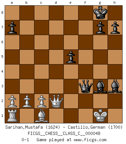 Last move : 0-1 2007 December 17 8:22:47 [Event "FICGS__CHESS__CLASS_C__000048"] [Site "FICGS"] [Date "2007.06.26"] [Round "1"] [White "Sarihan,Mustafa"] [Black "Castillo,German"] [Result "0-1"] [WhiteElo "1624"] [BlackElo "1700"] 1.e4 e5 2.Nf3 Nc6 3.Bc4 Nf6 4.Ng5 d5 5.exd5 Na5 6.Bb5+ c6 7.dxc6 bxc6 8.Qf3 Rb8 9.Bxc6+ Nxc6 10.Qxc6+ Nd7 11.d3 Be7 12.Ne4 Rb6 13.Qa4 f5 14.Ng3 O-O 15.Nc3 Nc5 16.Qa5 Be6 17.O-O Qb8 18.Nb1 f4 19.Nh1 f3 20.gxf3 Qb7 21.Re1 Bh3 22.Nd2 Rxf3 23.Ne4 Rb4 24.Nhg3 Rxg3+ 25.hxg3 Nxe4 26.dxe4 Rxe4 27.Rxe4 Qxe4 28.f3 Qxf3 29.Qd2 Qxg3+ 30.Kh1 Qf3+ 31.Kh2 Bh4 32.Kg1 Bg3 0-1 Two knights defense Kingside Castling by player Black (move 14) Kingside Castling by player White (move 17) Player Black won this chess game. Follow this game move after move (download)Fischer is under obligation to nobody. (Joseph Platz) Ein unbeabsichtigtes Patt ist der Gipfel der Dummheit. (Anonymous) Una buena ofensiva y una buena defensa, comienzan ambas con un buen desarrollo. (Bruce A. Moon) Mon pion favori sur ma case favorite ! Bronstein en parlant d'un coup de pion en h5 quand il avait les Noirs. You can think I'm wrong, but that's no reason to quit thinking. (Gregory House, House M.D.)