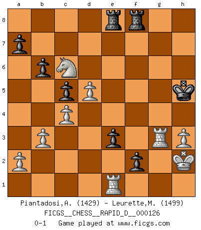 Last move : 0-1 2019 December 14 1:36:52 [Event "FICGS__CHESS__RAPID_D__000126"] [Site "FICGS"] [Date "2019.10.05"] [Round "1"] [White "Piantadosi,Angelo"] [Black "Leurette,Marc-Antoine"] [Result "0-1"] [WhiteElo "1429"] [BlackElo "1499"] 1.d4 d5 2.c4 e6 3.Nc3 Nf6 4.Bg5 Be7 5.e3 O-O 6.Nf3 Ne4 7.Bxe7 Qxe7 8.Nxe4 dxe4 9.Nd2 f5 10.Be2 b6 11.O-O Bb7 12.f3 exf3 13.Bxf3 Bxf3 14.Nxf3 Nd7 15.Qd3 c5 16.Rad1 g6 17.b3 Kg7 18.d5 Rad8 19.Qc3+ e5 20.Ne1 g5 21.Nf3 h5 22.Nd2 Kg6 23.e4 f4 24.Nf3 g4 25.Nd2 h4 26.h3 gxh3 27.gxh3 Qg5+ 28.Kh1 Kh5 29.Qf3+ Kh6 30.Rg1 Qh5 31.Rg4 Nf6 32.Rg2 Qxf3 33.Nxf3 Nxe4 34.Nxh4 Ng3+ 35.Kh2 Kh5 36.Nf3 e4 37.Ne5 Rde8 38.Nc6 e3 39.Re1 f3 40.Rxg3 f2 0-1 QGD : 6.Nf3 Kingside Castling by player Black (move 5) Kingside Castling by player White (move 11) Player Black won this chess game. Follow this game move after move (download)Fischer is the strongest player in the world. In fact, the strongest player who ever lived. (Larry Evans) Im Schach nämlich geht es darum, daß Ich des Gegners klein zu kriegen, sein Ego zu zerbrechen und zu zermahlen, seine Selbstachtung zu zertreten und zu verscharren und seine ganze mißachtenswerte sogenannte Persönlichkeit ein für alle Mal tot zu hacken und zu zerstampfen und dadurch die menschliche Gesellschaft von einer stinkenden Pestbeule zu befreien. Es ist ein königliches Spiel. (Robert James Fischer) Por tratar de evitar la pérdida de una pieza, muchas personas han perdido una partida de Ajedrez. (Savielly Tartakover) On croit qu'il y a plus de mauvais joueurs que de bons joueurs, c'est faux : Il y a autant de joueurs qui gagnent que de joueurs qui perdent. (Philippe Geluck) Creativity is allowing yourself to make mistakes. Art is knowing which ones to keep. (Scott Adams)