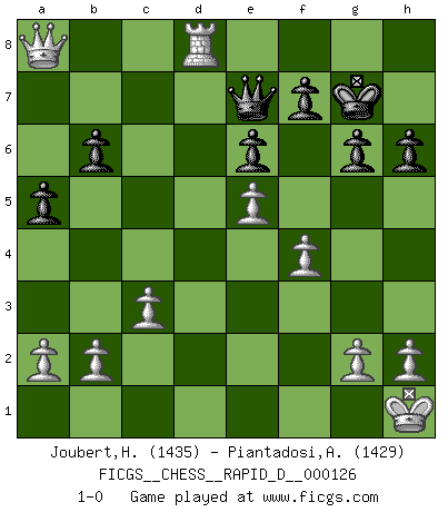 Last move : 1-0 2019 December 7 2:31:1 [Event "FICGS__CHESS__RAPID_D__000126"] [Site "FICGS"] [Date "2019.10.05"] [Round "1"] [White "Joubert,Hennie"] [Black "Piantadosi,Angelo"] [Result "1-0"] [WhiteElo "1435"] [BlackElo "1429"] 1.e4 e6 2.d4 d5 3.Nd2 dxe4 4.Nxe4 Nd7 5.Nf3 Ngf6 6.Bd3 Be7 7.O-O O-O 8.Bg5 b6 9.c3 Bb7 10.Ne5 Nxe5 11.dxe5 Nd7 12.Bxe7 Qxe7 13.f4 Nc5 14.Nxc5 Qxc5+ 15.Kh1 Rfd8 16.Qc2 h6 17.Rad1 a5 18.Be4 Bxe4 19.Qxe4 c6 20.Qf3 Kf8 21.Rd3 Rxd3 22.Qxd3 g6 23.Rd1 Qe7 24.Qd6 Ke8 25.Qxc6+ Kf8 26.Qxa8+ Kg7 27.Rd8 1-0 French : Tarrasch Kingside Castling by player White (move 7) Kingside Castling by player Black (move 7) Player White won this chess game. Follow this game move after move (download)When asked, -How is that you pick better moves than your opponents?, I responded: I'm very glad you asked me that, because, as it happens, there is a very simple answer. I think up my own moves, and I make my opponent think up his. (Alexander Alekhine) Ich trinke, ich rauche, ich spiele, ich liebe Frauen aber Fernschach ist ein Laster, das ich nicht habe. (Mikhail Nekhemyevich Tal) ¿Quién es tu oponente esta tarde? Esta tarde mi oponente son las piezas negras. (Akiba Rubinstein) Il vaut mieux sacrifier les pièces de l'adversaire. (Xavier Tartacover) Follow your passion, and success will follow you. (Arthur Buddhold)