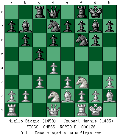 Last move : 0-1 2019 November 1 22:55:49 [Event "FICGS__CHESS__RAPID_D__000126"] [Site "FICGS"] [Date "2019.10.05"] [Round "1"] [White "Niglio,Biagio"] [Black "Joubert,Hennie"] [Result "0-1"] [WhiteElo "1458"] [BlackElo "1435"] 1.d4 Nf6 2.Nf3 g6 3.Bf4 Bg7 4.e3 O-O 5.Be2 d6 6.O-O Nbd7 7.h3 c5 8.c3 b6 9.Nbd2 Bb7 10.Bh2 Rc8 0-1 King's Indian : London system Kingside Castling by player Black (move 4) Kingside Castling by player White (move 6) Player Black won this chess game. Follow this game move after move (download)Of all my Russian books, the defense contains and diffuses the greatest 'warmth' which may seem odd seeing how supremely abstract Chess is supposed to be. (Vladimir Nabokov) Nur ein wirklich starker Spieler weiß wie schwach er spielt. (Savielly Grigorievitsch Tartakower) Cuando estes solo, cuando te sientas un extraño en el mundo, juega al Ajedrez. Esto levantará tu espiritu y será tu consejero de guerra. (Aristóteles) Je ne suis pas le dernier à jouer lâchement des coups douteux pendant le zeïtnot de l'adversaire pour l'achever: en effet les coups qui font le plus peur sont ceux que l'on ne comprend pas. Je me fais souvent peur quand je joue. (Un professeur anonyme) There are lots of people who mistake their imagination for their memory. (Josh Bilings)