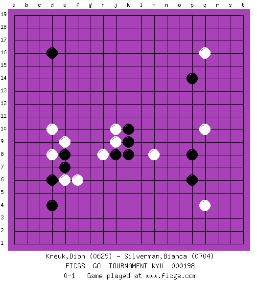 Last move : 0-1 2019 November 18 18:15:11 [Event "FICGS__GO__TOURNAMENT_KYU__000198"] [Site "FICGS"] [Date "2019.10.06"] [Round "1"] [Black "Kreuk,Dion"] [White "Silverman,Bianca"] [Result "0-1"] [Rating 1 "0629"] [Rating 2 "0704"] 1.d16 q4 2.d4 q16 3.p14 d10 4.p6 q10 5.k10 j10 6.k9 j9 7.p8 e6 8.d6 m8 9.e7 f6 10.j8 h8 11.k8 d8 12.e8 e9 0-1 This go game has been lost on time (started : 2019.10.06 20:41:51) Here are the names of the openings (joseki) played in the four corners : Corner q16 : q16 p14 Hoshi (Hwajeom, Seongjeom, Xingwei`) 4-4 Point. The star or hoshi (4-4) point, emphasizing influence at the potential expense of territory. Corner q4 : q4 p6 Hoshi (Hwajeom, Seongjeom, Xingwei`) 4-4 Point. The star or hoshi (4-4) point, emphasizing influence at the potential expense of territory. Corner d4 : d4 j9 Hoshi (Hwajeom, Seongjeom, Xingwei`) 4-4 Point. The star or hoshi (4-4) point, emphasizing influence at the potential expense of territory. Player White won this Go (weiqi, baduk) game. Follow this game move after move (download)The nature of a game comes from what is played, but it's the sensitivity to the possible and the impossible that gives it value. (Pierre Audouard) Life is pleasant. Death is peaceful. It's the transition that's troublesome. (Isaac Asimov)