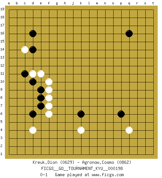 Last move : 0-1 2019 December 11 23:20:22 [Event "FICGS__GO__TOURNAMENT_KYU__000198"] [Site "FICGS"] [Date "2019.10.06"] [Round "1"] [Black "Kreuk,Dion"] [White "Agronow,Cosmo"] [Result "0-1"] [Rating 1 "0629"] [Rating 2 "0862"] 1.q16 d4 2.d16 q4 3.p6 k4 4.k6 c14 5.d14 d11 6.d10 e11 7.c11 f8 8.d6 f6 9.e7 f7 10.e8 f10 11.e9 f9 0-1 This go game has been lost on time (started : 2019.10.06 20:41:51) Here are the names of the openings (joseki) played in the four corners : Corner q4 : q4 p6 Hoshi (Hwajeom, Seongjeom, Xingwei`) 4-4 Point. The star or hoshi (4-4) point, emphasizing influence at the potential expense of territory. Corner d16 : d16 c14 Hoshi (Hwajeom, Seongjeom, Xingwei`) 4-4 Point. The star or hoshi (4-4) point, emphasizing influence at the potential expense of territory. Ikken Kakari (Hankan Keolch'im, Yi Gua`jiao~, 1-Space Low Approach). White 2 is the standard approach move to the 4-4. Player White won this Go (weiqi, baduk) game. Follow this game move after move (download)In the opening, when you don't know what to play, make a shimari. (Jansteen) A specialist learns more and more about less and less until he knows everything about nothing. (Nicholas Murray Butler)