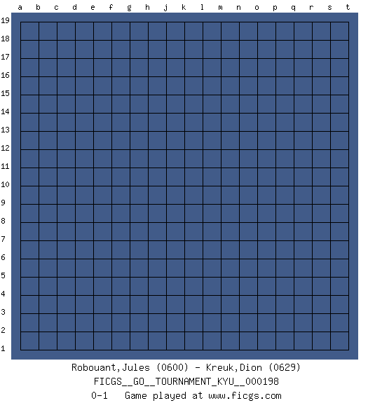 Last move : 0-1 2019 November 6 0:3:6 [Event "FICGS__GO__TOURNAMENT_KYU__000198"] [Site "FICGS"] [Date "2019.10.06"] [Round "1"] [Black "Robouant,Jules"] [White "Kreuk,Dion"] [Result "0-1"] [Rating 1 "0600"] [Rating 2 "0629"] 0-1 This go game has been lost on time (started : 2019.10.06 20:41:51) Here are the names of the openings (joseki) played in the four corners : Player White won this Go (weiqi, baduk) game. Follow this game move after move (download)Josekis are not fixed, definitive things. They indicate the moments when everything can change. (Pierre Audouard) Luck is when opportunity knocks and you answer. (Anonymous)