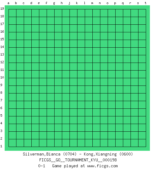 Last move : 0-1 2019 November 6 0:3:6 [Event "FICGS__GO__TOURNAMENT_KYU__000198"] [Site "FICGS"] [Date "2019.10.06"] [Round "1"] [Black "Silverman,Bianca"] [White "Kong,Xiangning"] [Result "0-1"] [Rating 1 "0704"] [Rating 2 "0600"] 0-1 This go game has been lost on time (started : 2019.10.06 20:41:51) Here are the names of the openings (joseki) played in the four corners : Player White won this Go (weiqi, baduk) game. Follow this game move after move (download)Go is not a blocking game, it's a game of action. (Pierre Audouard) Difficult things take a long time, impossible things a little longer. (Author unknown)