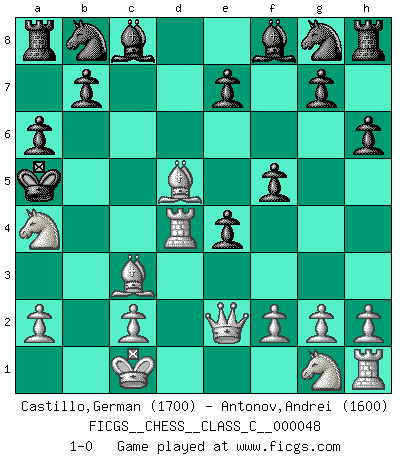 Last move : 1-0 2007 August 5 16:17:31 [Event "FICGS__CHESS__CLASS_C__000048"] [Site "FICGS"] [Date "2007.06.26"] [Round "1"] [White "Castillo,German"] [Black "Antonov,Andrei"] [Result "1-0"] [WhiteElo "1700"] [BlackElo "1600"] 1.d4 d5 2.e4 dxe4 3.Nc3 f5 4.Bg5 h6 5.Qh5+ Kd7 6.Bc4 c6 7.d5 a6 8.O-O-O Qc7 9.dxc6+ Kxc6 10.Bd5+ Kb6 11.Be3+ Ka5 12.b4+ Kxb4 13.Rd4+ Kc5 14.Na4+ Kb5 15.Qe2+ Ka5 16.Bd2+ Qc3 17.Bxc3+ 1-0 Blackmar gambit Queenside Castling by player White (move 8) Player White won this chess game. Follow this game move after move (download)If Chess is a science, it's a most inexact one. If Chess is an art, it is too exacting to be seen as one. If Chess is a sport, it's too esoteric. If Chess is a game, it's too demanding to be just a game. If Chess is a mistress, she's a demanding one. If Chess is a passion, it's a rewarding one. If Chess is life, it's a sad one. (Unknown) Der Vorposten provoziert a) eine Basis für neue Angriffe und b) eine Schwächung der gegnerischen Widerstandskraft in der fraglichen Linie. (Aaron Nimzowitsch) Todos los jugadores de Ajedrez deberían tener un pasatiempo. (Savielly Tartakower) Avant la finale, les dieux ont créé le milieu de partie. (Tarrasch) Fear is the path to the dark side. Fear leads to anger; anger leads to hate; hate leads to suffering. I sense much fear in you. (Master Yoda in Star Wars ep.1)