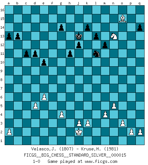 Last move : 1-0 2019 November 7 14:51:16 [Event "FICGS__BIG_CHESS__STANDARD_SILVER__000015"] [Site "FICGS"] [Date "2019.10.09"] [Round "2"] [White "Velasco,Jose Maria"] [Black "Kruse,Herbert"] [Result "1-0"] [WhiteElo "1807"] [BlackElo "1981"] 1.j2-k4 j15-k13 2.h1-o7 h15-g13 3.d2-d4 p16-o14 4.e2-e4 m15-m13 5.f1-b5 l16-p12 6.b1-c3 b16-c14 7.m2-m4 h16-m12 8.e4-e5 p12-m9 9.o7-j7 g16-j15 10.n2-n4 e15-e13 11.o1-f9 k13-l11 12.l1-p5 m12-n12 13.n4-n5 n12-c2 14.h2-g4 m9-g4 15.h3-g4 c2-f2 16.c1-e3 f2-g2 17.k1-h2 g2-b2 18.a1-c1 b2-a3 19.j7-f10 a3-l13 20.p5-g13 l13-g13 21.f10-f15 g13-g14 22.f15-b11 k16-h15 23.b11-l11 l15-l14 24.f9-j12 h14-h13 25.j12-g10 m13-m12 26.l11-e11 g14-h14 27.e11-e9 h14-j13 28.e9-m9 n15-n13 29.e1-f1 f16-b12 30.l2-l3 d15-d14 31.m9-b9 j13-e9 32.b9-a8 g15-g14 33.f1-f9 e9-j13 34.d4-d5 c16-f13 35.a8-b8 o16-f8 36.g1-j2 f8-d10 37.b8-d6 m16-m13 38.g10-h9 m13-m15 39.f9-f6 e16-f16 40.c1-f1 f13-d15 41.f6-f16 a16-f16 42.f1-f16 j13-f16 43.d6-f6 d15-f13 44.j2-h4 f16-n9 45.b5-g10 d10-g7 46.f6-f5 n9-j9 47.e3-f4 g7-k4 48.l3-k4 b12-k4 49.f5-j8 j9-j8 50.h9-j8 k4-d10 51.j1-j2 c14-d16 52.f4-l9 h15-g13 53.p1-n2 b15-b14 54.m1-f1 d16-e14 55.g10-h9 j16-h15 56.j8-o13 m15-m16 57.c3-b5 o14-m13 58.h9-g8 j15-k13 59.o13-h7 m16-f16 60.f1-f3 f13-n6 61.k2-k3 f16-f3 62.h4-f3 q15-q14 63.q1-f1 n6-m7 64.h7-k5 m7-k5 65.g8-k5 q16-f16 66.f3-g5 f16-f1 67.h2-f1 d10-e11 68.o2-o3 a15-a13 69.e5-e6 j14-j13 70.g5-f7 h15-h14 71.f1-e3 h13-h12 72.f7-e9 m13-k12 73.k5-l6 k12-j10 74.l9-g5 e14-d12 75.g5-e7 e11-g9 76.e3-f5 g9-e7 77.f5-e7 h12-h11 78.e7-f9 k13-h12 79.f9-e11 h14-h13 80.b5-c7 g13-e14 81.e11-d13 h13-g13 82.c7-b9 b14-b13 83.b9-d10 j10-g11 84.e9-f11 h12-f11 85.d10-f11 d12-f11 86.l6-f11 k15-k14 87.f11-k15 l14-l13 88.n2-o4 c15-c14 89.d13-c11 d14-d13 90.c11-e10 g11-e10 91.k15-e10 e14-f12 92.e10-d9 c14-c13 93.o4-n6 e13-e12 94.n6-m8 e12-e11 95.m8-l10 e11-e10 96.d9-f7 o15-o14 97.l10-j11 d13-d12 98.j11-l12 f12-h13 99.f7-g6 j13-j12 100.g6-p14 c13-c12 101.l12-m14 d12-d11 102.m14-n16 c12-c11 103.n16-p15 h13-k12 104.p15-n16 k12-m13 105.p14-o15 m13-l11 106.n16-o14 g13-h12 107.o14-m15 h12-j13 108.m15-n13 1-0 Follow this game move after move (download)The game of chess is the touchstone of the intellect. (Goethe) Wenn Spassky eine Figur opfert kannst du genauso gut aufgeben. Aber wenn Tal eine Figur opfert, spiel weiter. Er könnte noch eine weitere opfern, und dann ... wer weiß? (Miguel Najdorf) Todavía soy una víctima del Ajedrez. Tiene toda la belleza del arte y mucho mas. No puede ser comercializado. El Ajedrez es mas puro que el arte en su posición social. (Marcel Duchamp) Les échecs sont utiles à l'exercice de la faculté de penser et à celle de l'imagination. Car nous devons posséder une méthode élaborée pour atteindre des buts partout où nous devons conduire notre raison. (Leibnitz) History is a gallery of pictures in which there are few originals and many copies. (Alexis de Tocqueville)