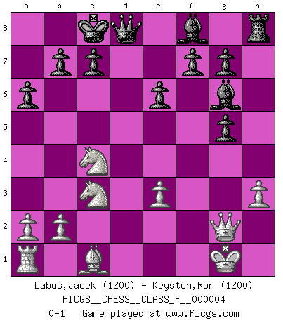 Last move : 0-1 2006 September 5 11:29:53 [Event "FICGS__CHESS__CLASS_F__000004"] [Site "FICGS"] [Date "2006.06.18"] [Round "1"] [White "Labus,Jacek"] [Black "Keyston,Ron"] [Result "0-1"] [WhiteElo "1200"] [BlackElo "1200"] 1.e4 d5 2.exd5 Qxd5 3.Nc3 Qd6 4.Nf3 Nf6 5.Bc4 a6 6.O-O Bg4 7.h3 Bh5 8.Re1 Nc6 9.g4 Bg6 10.d4 O-O-O 11.g5 Nh5 12.d5 Nf4 13.dxc6 Qxc6 14.Bd3 Nxd3 15.cxd3 Rxd3 16.Nd2 e6 17.Re3 Rxe3 18.fxe3 h6 19.Qf3 Qd7 20.Nc4 Qd8 21.Qg2 hxg5 0-1 Scandinavian : Pytel-Wade variation Kingside Castling by player White (move 6) Queenside Castling by player Black (move 10) Player Black won this chess game. Follow this game move after move (download)The essence of Chess is thinking about what Chess is. (David Bronstein) Herr Iljumschinow ist ein etwas merkwürdiger Geschäftsmann: Er arbeitet zusammen mit Leuten wie Muammar al-Gaddafi; früher ist das Saddam Hussein gewesen. (Joel Lautier) Un buen jugador siempre tiene buena suerte. (José Raúl Capablanca) Roi des jeux et jeu des rois, les échecs portent en eux un sentiment d'infini. Ils donnent à celui qui s'est efforcé d'en approfondir les arcanes l'impression de n'être pas à la mesure de l'homme; en fait, ils constituent un résumé de l'univers, un microcosme, et figurent cette grande échelle qui, dans les plans de la lumière descend jusqu'à la matière, qui des abîmes insondables remonte jusqu'en l'infini de Dieu. (Pyrame) The hypothalamus is one of the most important parts of the brain, involved in many kinds of motivation, among other functions. The hypothalamus controls the 'Four Fs: Fighting, Fleeing, Feeding and Mating. (Unknown author)