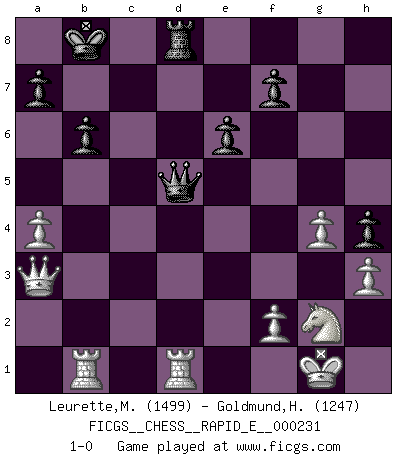 Last move : 1-0 2019 November 19 8:5:40 [Event "FICGS__CHESS__RAPID_E__000231"] [Site "FICGS"] [Date "2019.10.11"] [Round "1"] [White "Leurette,Marc-Antoine"] [Black "Goldmund,Heike"] [Result "1-0"] [WhiteElo "1499"] [BlackElo "1247"] 1.e4 d5 2.exd5 Qxd5 3.Nc3 Qa5 4.Nf3 Nf6 5.d4 Bg4 6.Be2 e6 7.Bd2 c6 8.h3 Bf5 9.O-O Qc7 10.Re1 Bd6 11.Nh4 Be4 12.Bf1 Nbd7 13.Nxe4 Nxe4 14.Rxe4 Nf6 15.Re1 O-O-O 16.c3 h6 17.g3 g5 18.Ng2 Rdg8 19.b4 h5 20.a4 h4 21.g4 Nd5 22.b5 Re8 23.bxc6 Qxc6 24.Bb5 Qc7 25.Bxe8 Rxe8 26.c4 Qxc4 27.Rc1 Nc3 28.Bxc3 Qd5 29.Bd2 Kb8 30.Bxg5 Qxg5 31.d5 Ba3 32.Rb1 Rd8 33.Qb3 Qxd5 34.Qxa3 b6 35.Red1 1-0 Scandinavian (centre counter) defense Kingside Castling by player White (move 9) Queenside Castling by player Black (move 15) Player White won this chess game. Follow this game move after move (download)Chess is no whit inferior to the violin, and we have a large number of professional violinists. (Mikhail Botvinnik) Wenn ich gewinne bin ich ein Genie. Wenn nicht, dann bin ich keines. (Robert James Fischer) Siempre es mejor sacrificar los hombres de tu oponente. (Savielly Tartakower) Votre seul travail dans les ouvertures est d'obtenir un milieu de partie jouable. (Lajos Portish) A good aphorism is too hard for the tooth of time, and is not worn away with the centuries, although it serves as food for every speech. (Friedrich Nietzsche)