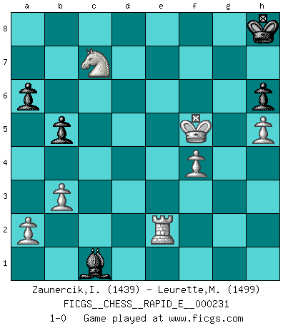 Last move : 1-0 2019 October 22 12:34:35 [Event "FICGS__CHESS__RAPID_E__000231"] [Site "FICGS"] [Date "2019.10.11"] [Round "1"] [White "Zaunercik,Ilmar"] [Black "Leurette,Marc-Antoine"] [Result "1-0"] [WhiteElo "1439"] [BlackElo "1499"] 1.e4 e5 2.Nf3 Nc6 3.Bb5 a6 4.Ba4 Nf6 5.d3 Bc5 6.O-O b5 7.Bb3 d6 8.c3 O-O 9.Nbd2 Re8 10.Re1 h6 11.h3 Bb6 12.Nf1 Na5 13.Bc2 c5 14.d4 cxd4 15.cxd4 exd4 16.Nxd4 d5 17.e5 Ne4 18.Bxe4 dxe4 19.Nb3 Nc4 20.Qxd8 Rxd8 21.Ng3 Nxe5 22.Nxe4 Be6 23.Be3 Bc7 24.Nbc5 Bd5 25.b3 Ng6 26.Rac1 Bxe4 27.Nxe4 Be5 28.g3 f5 29.Nc5 f4 30.gxf4 Nxf4 31.Bxf4 Bxf4 32.Rcd1 Rdc8 33.Ne6 Bc7 34.Rd7 Ba5 35.Rxg7+ Kh8 36.Re2 Rg8 37.Rxg8+ Rxg8+ 38.Kh2 Bb4 39.h4 Re8 40.h5 Ba3 41.Kg3 Bc1 42.Kg4 Rg8+ 43.Kf5 Rc8 44.f4 Rc7 45.Nxc7 1-0 Ruy Lopez : Anderssen variation Kingside Castling by player White (move 6) Kingside Castling by player Black (move 8) Player White won this chess game. Follow this game move after move (download)I like to say that Bobby Fischer was the greatest player ever. But what made Fischer a genius was his ability to blend an American freshness and pragmatism with Russian ideas about strategy. (Bruce Pandolfini) Vom Schach wurde gesagt das Leben sei dafür nicht lange genug. Aber das ist der Fehler des Lebens, nicht des Schach'. (Irving Chernev) Durante una competencia de Ajedrez, un Maestro de Ajedrez deberá ser una combinación de presa de caza y un Monge. (Alexander Alekhine) La solitude du joueur d'Echecs à l'approche du mat est semblable à celle du condamné. (Francis Szpiner) All war is based on deception. (Sun Tzu)