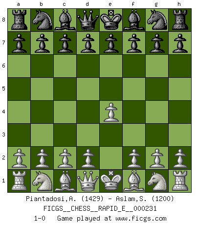 Last move : 1-0 2019 November 10 13:40:52 [Event "FICGS__CHESS__RAPID_E__000231"] [Site "FICGS"] [Date "2019.10.11"] [Round "1"] [White "Piantadosi,Angelo"] [Black "Aslam,Salehzada"] [Result "1-0"] [WhiteElo "1429"] [BlackElo "1200"] 1.e4 1-0 This chess game has been lost on time (started : 2019.10.11 1:36:17) King's pawn Opening Player White won this chess game. Follow this game move after move (download)Examine moves that smite! A good eye for smites is far more important than a knowledge of strategical principles. (Purdy) Warum muß ich gegen diesen IDIOTEN verlieren? (Aaron Nimzowitsch) ¡Examina movidas que hagan daño! Un buen ojo for movidas desvastantes es mucho mas importante que el conocimiento de principios estratégicos. (Purdy) Les échecs, c'est l'art d'analyser. (Mikhail Botvinnik) Chess, like love, like music, has the power to make people happy. (Siegbert Tarrasch)