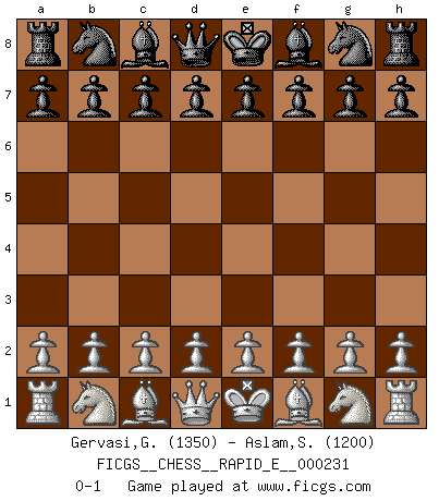 Last move : 0-1 2019 November 10 13:40:52 [Event "FICGS__CHESS__RAPID_E__000231"] [Site "FICGS"] [Date "2019.10.11"] [Round "1"] [White "Gervasi,Giuseppe"] [Black "Aslam,Salehzada"] [Result "0-1"] [WhiteElo "1350"] [BlackElo "1200"] 0-1 This chess game has been lost on time (started : 2019.10.11 1:36:17) Player Black won this chess game. Follow this game move after move (download)The passed Pawn is a criminal, who should be kept under lock and key. Mild measures, such as police surveillance, are not sufficient. (Aaron Nimzovich) Die Idee von Capablanca, Schach als Fach in den Schulen zu lehren, ist großartig. (Fidel Castro) Debemos de asegurarnos de que el Ajedrez no se convierta en un lenguaje muerto, muy interesante, pero solo para un grupo muy pequeño. (Sytze Faber) A ce moment-là, je menaçais de comprendre la position ! (Clément L'Heureux) Watch your thoughts; they become words. Watch your words; they become actions. Watch your actions; they become habits. Watch your habits; they become character. Watch your character; it becomes your destiny. (Frank Outlaw)