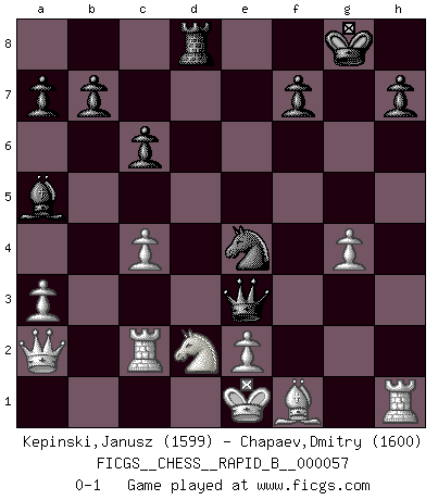 Last move : 0-1 2007 August 31 23:6:13 [Event "FICGS__CHESS__RAPID_B__000057"] [Site "FICGS"] [Date "2007.06.26"] [Round "1"] [White "Kepinski,Janusz"] [Black "Chapaev,Dmitry"] [Result "0-1"] [WhiteElo "1599"] [BlackElo "1600"] 1.d4 d5 2.c4 c6 3.b3 Nf6 4.Bf4 dxc4 5.bxc4 e5 6.Bxe5 Bb4+ 7.Nd2 Ne4 8.Ngf3 O-O 9.a3 Ba5 10.Bf4 Re8 11.Rc1 Nd7 12.Rc2 Ndf6 13.h3 g5 14.Nxg5 Qxd4 15.Ngxe4 Nxe4 16.Be3 Nc5 17.Qb1 Rxe3 18.fxe3 Qxe3 19.g4 Ne4 20.Qa2 Bxg4 21.hxg4 Rd8 0-1 QGD Slav defense Kingside Castling by player Black (move 8) Player Black won this chess game. Follow this game move after move (download)Chess is a sea in which a gnat may drink and an elephant may bathe. (Hindu proverb) Ich glaube nicht an Psychologie, ich glaube an gute Züge. (Robert James Fischer) Los tropiezos estan todos ahí en el tablero, esperando que se cometan. (Savielly Tartakover) La solitude du joueur d'Echecs à l'approche du mat est semblable à celle du condamné. (Francis Szpiner) Experiences are the keys to life. (Daniel Parmet)