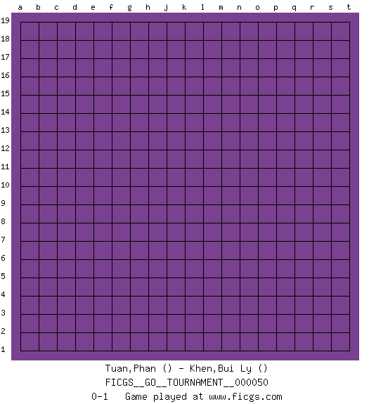 Last move : 0-1 2019 November 10 13:40:52 [Event "FICGS__GO__TOURNAMENT__000050"] [Site "FICGS"] [Date "2019.10.11"] [Round "1"] [Black "Tuan,Phan"] [White "Khen,Bui Ly"] [Result "0-1"] 0-1 This go game has been lost on time (started : 2019.10.11 1:36:49) Here are the names of the openings (joseki) played in the four corners : Player White won this Go (weiqi, baduk) game. Follow this game move after move (download)Don't count territory held by only one eye. (Anonymous) Locking firmely the window serves nothing, only small thiefs pass through there, the big thiefs enter through the front door. (Luc-Olivier Leclerc)