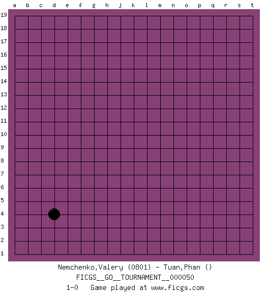 Last move : 1-0 2019 November 11 4:0:28 [Event "FICGS__GO__TOURNAMENT__000050"] [Site "FICGS"] [Date "2019.10.11"] [Round "1"] [Black "Nemchenko,Valery"] [White "Tuan,Phan"] [Result "1-0"] [Rating 1 "0801"] 1.d4 1-0 This go game has been lost on time (started : 2019.10.11 1:36:49) Here are the names of the openings (joseki) played in the four corners : Corner d4 : d4 1-0 Hoshi (Hwajeom, Seongjeom, Xingwei`) 4-4 Point. The star or hoshi (4-4) point, emphasizing influence at the potential expense of territory. Player Black won this Go (weiqi, baduk) game. Follow this game move after move (download)Balance is not what players strike for, and if it does arise, it is in spite of them. (Pierre Audouard) Somewhere in the world there is an epigram for every dilemma. (Hendrik Willem van Loon)