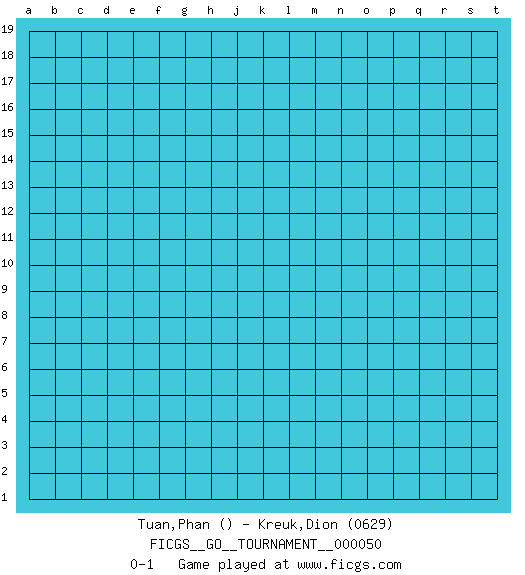 Last move : 0-1 2019 November 10 13:40:52 [Event "FICGS__GO__TOURNAMENT__000050"] [Site "FICGS"] [Date "2019.10.11"] [Round "1"] [Black "Tuan,Phan"] [White "Kreuk,Dion"] [Result "0-1"] [Rating 2 "0629"] 0-1 This go game has been lost on time (started : 2019.10.11 1:36:49) Here are the names of the openings (joseki) played in the four corners : Player White won this Go (weiqi, baduk) game. Follow this game move after move (download)There are possible things, impossible things, and things that happen. Sometimes things happen that were impossible. (Pierre Audouard) The right perception of any matter and a misunderstanding of the same matter do not wholly exclude each other. (Kafka's the trial)