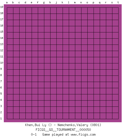 Last move : 0-1 2019 November 10 13:40:52 [Event "FICGS__GO__TOURNAMENT__000050"] [Site "FICGS"] [Date "2019.10.11"] [Round "1"] [Black "Khen,Bui Ly"] [White "Nemchenko,Valery"] [Result "0-1"] [Rating 2 "0801"] 0-1 This go game has been lost on time (started : 2019.10.11 1:36:49) Here are the names of the openings (joseki) played in the four corners : Player White won this Go (weiqi, baduk) game. Follow this game move after move (download)Go is to western chess what philosophy is to double entry accounting. (from Shibumi, by Trevanian) If we don't succeed, we run the risk of failure. (George W. Bush)