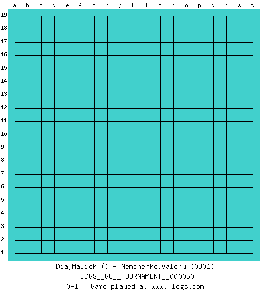 Last move : 0-1 2019 November 10 13:40:52 [Event "FICGS__GO__TOURNAMENT__000050"] [Site "FICGS"] [Date "2019.10.11"] [Round "1"] [Black "Dia,Malick"] [White "Nemchenko,Valery"] [Result "0-1"] [Rating 2 "0801"] 0-1 This go game has been lost on time (started : 2019.10.11 1:36:49) Here are the names of the openings (joseki) played in the four corners : Player White won this Go (weiqi, baduk) game. Follow this game move after move (download)Connect with good shape. (Anonymous) Computers are like Old Testament gods; lots of rules and no mercy. (Joseph Campbell)