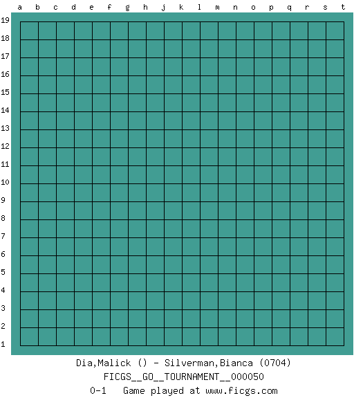 Last move : 0-1 2019 November 10 13:40:52 [Event "FICGS__GO__TOURNAMENT__000050"] [Site "FICGS"] [Date "2019.10.11"] [Round "1"] [Black "Dia,Malick"] [White "Silverman,Bianca"] [Result "0-1"] [Rating 2 "0704"] 0-1 This go game has been lost on time (started : 2019.10.11 1:36:49) Here are the names of the openings (joseki) played in the four corners : Player White won this Go (weiqi, baduk) game. Follow this game move after move (download)Josekis are not fixed, definitive things. They indicate the moments when everything can change. (Pierre Audouard) Beep ! (R2D2 in Star Wars ep.3)