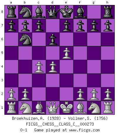 Last move : 0-1 2019 December 20 1:27:15 [Event "FICGS__CHESS__CLASS_C__000273"] [Site "FICGS"] [Date "2019.10.11"] [Round "1"] [White "Broekhuizen,A. T. S."] [Black "Vollmer,Steve"] [Result "0-1"] [WhiteElo "1928"] [BlackElo "1756"] 1.e4 Nf6 2.e5 Nd5 3.d4 d6 4.c4 Nb6 0-1 This chess game has been lost on time (started : 2019.10.11 21:42:55) Alekhine's defense Player Black won this chess game. Follow this game move after move (download)Weak points or holes in the opponent's position must be occupied by pieces not Pawns. (Siegbert Tarrasch) Der Partner hat auch seine Existenzberechtigung. (Savielly Grigorievitsch Tartakower) El Ajedrez es un mar en el cual un mosquito puede beber y un elefante puede bañarse. (Refrán Hindú) Ne tendez aucun piège pour le plaisir ! Ne jouez rien dans l'espoir que l'adversaire réagisse de façon stupide ! Prenez toujours pour acquis que l'adversaire va trouver le meilleur coup ! Ne jouez jamais de coup dans l'espoir que l'adversaire ne voie pas la menace ! Chacun de vos coups doit améliorer la position d'une façon ou d'une autre. You must have a dream in order to have it come true. (A.P.J. Kalam)