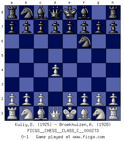 Last move : 0-1 2019 November 9 22:22:46 [Event "FICGS__CHESS__CLASS_C__000273"] [Site "FICGS"] [Date "2019.10.11"] [Round "1"] [White "Kuliy,Oleksandr"] [Black "Broekhuizen,A. T. S."] [Result "0-1"] [WhiteElo "1925"] [BlackElo "1928"] 1.d4 Nf6 0-1 Queen's pawn game Player Black won this chess game. Follow this game move after move (download)If one piece is badly posted, the whole game is bad. (Tarrasch) Früher wurde jeder komplizierte Zug, jedes interessante Opfer mit großem Beifall und Enthusiasmus aufgenommen. Heute schaltet man einfach seinen Fritz an, und man kann sehen, was los ist, ob der Zug geht oder nicht. (Vladimir Kramnik) Uno por uno, yo los acribillé, mi superioridad muy pronto se volvio aparente. (Jose Capablanca) 'L'échange des dames est un coup dur pour les deux adversaires...' Un journaliste lors d'une partie du match Spassky-Fischer I fear not the man who has practiced 10,000 kicks once, but I fear the man who has practiced one kick 10,000 times. (Bruce Lee)