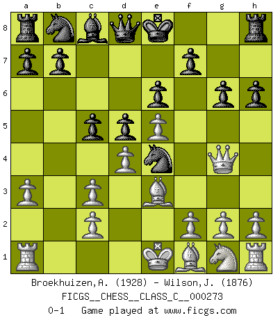 Last move : 0-1 2020 January 15 14:6:26 [Event "FICGS__CHESS__CLASS_C__000273"] [Site "FICGS"] [Date "2019.10.11"] [Round "1"] [White "Broekhuizen,A. T. S."] [Black "Wilson,Jaimie"] [Result "0-1"] [WhiteElo "1928"] [BlackElo "1876"] 1.e4 e6 2.d4 d5 3.Nc3 Nf6 4.Bg5 Bb4 5.e5 h6 6.Be3 Ne4 7.Qg4 g6 8.a3 Bxc3+ 9.bxc3 c5 0-1 French : MacCutcheon, Janowski variation Player Black won this chess game. Follow this game move after move (download)Spassky will not be psyched out by Fischer. (Mike Goodall) Computer sind die einzigen Gegner, die nicht immer eine Ausrede auf Lager haben, wenn sie gegen mich verlieren. (Robert James Fischer) Si no le temes a Spassky, entonces elimino el elemento del dinero. (Jim Slater) Les échecs, c'est l'art d'analyser. (Mikhail Botvinnik) Work expands to fill the time available. (C. Northcote Parkinson, in Parkinson's Laws)