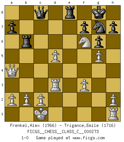 Last move : 1-0 2019 November 12 6:47:43 [Event "FICGS__CHESS__CLASS_C__000273"] [Site "FICGS"] [Date "2019.10.11"] [Round "1"] [White "Frenkel,Alex"] [Black "Trigance,Emile"] [Result "1-0"] [WhiteElo "1966"] [BlackElo "1716"] 1.e4 c5 2.Nf3 d6 3.d4 cxd4 4.Nxd4 Nf6 5.Nc3 g6 6.Be3 Bg7 7.f3 O-O 8.Qd2 Nc6 9.O-O-O d5 10.Qe1 Nxd4 11.Bxd4 Be6 12.g4 Qa5 13.g5 Nh5 14.Bxg7 Kxg7 15.exd5 Bf5 16.Qe5+ Kg8 17.Bd3 Ng7 18.Qxe7 Bxd3 19.Rxd3 Rfe8 20.Qxb7 Rab8 21.Qc6 Rb6 22.Qa4 Qc5 23.Ne4 Qc8 24.Nf6+ 1-0 Sicilian : Dragon, Yugoslav attack, 7...O-O Kingside Castling by player Black (move 7) Queenside Castling by player White (move 9) Player White won this chess game. Follow this game move after move (download)I look one move ahead... the best ! (Siegbert Tarrasch) Alles was ich jemals tun will ist Schach spielen. (Robert James Fischer) Por esta medida (el intervalo entre Fischer y sus contemporaneos), yo le considero el mas grande campeón mundial. (Garry Kasparov) L'action d'une oeuvre littéraire se déroule sur un champ de bataille. Les masques et les types du drame moderne correspondent aux pièces du jeu d'échecs. L'intrigue correspond aux coups et aux gambits, c'est à dire aux techniques du jeu telles qu'utilisées et interprétées par les joueurs. Les tactiques et les péripéties [mouvements] correspondent aux coups exécutés par l'adversaire. (Viktor Shklovsky) Experience is the name we all give to our mistakes. (Oscar Wilde)