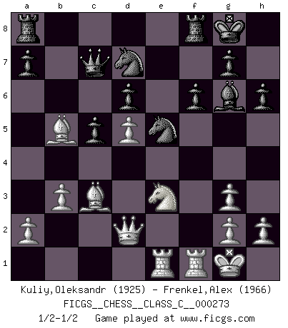 Last move : 1/2-1/2 2019 October 30 15:58:21 [Event "FICGS__CHESS__CLASS_C__000273"] [Site "FICGS"] [Date "2019.10.11"] [Round "1"] [White "Kuliy,Oleksandr"] [Black "Frenkel,Alex"] [Result "1/2-1/2"] [WhiteElo "1925"] [BlackElo "1966"] 1.d4 Nf6 2.c4 c5 3.d5 b5 4.Qc2 bxc4 5.e4 e6 6.Bxc4 Be7 7.Nc3 exd5 8.exd5 O-O 9.Nge2 d6 10.O-O Nbd7 11.Ng3 Nb6 12.b3 Ng4 13.Bd3 h6 14.Bb2 Bh4 15.Rae1 Bxg3 16.fxg3 Ne5 17.Bb5 Bd7 18.Be2 f6 19.Qd2 Be8 20.Nd1 Bg6 21.Ne3 Qc7 22.Bb5 Nbd7 23.Bc3 1/2-1/2 Benko gambit Kingside Castling by player Black (move 8) Kingside Castling by player White (move 10) This chess game ended in a draw. Follow this game move after move (download)One of these modest little moves may be more embarrassing to your opponent than the biggest threat. (Siegbert Tarrasch) Wenn ich einen Club besuche, sind die Spieler stumm vor Staunen. (José Raúl Capablanca) Yo adoro todas la posiciones. Denme una partida posicional difícil, y la jugaré. Pero posiciones totalmente ganadas, no las tolero. (Hein Donner) Le joueur d'Echecs qui veut atteindre le top est obligé de développer son propre credo créatif. Alexeï Stepanovicth Souétine. Il est facile d'écrire des livres ! Ce qui est difficile, c'est de jouer ! (Alexeï Stepanovicth Souétine) A mistake is only a mistake if you let it happen twice. Otherwise it is a learning experience. (Daniel Parmet)