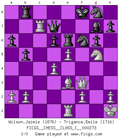 Last move : 1-0 2020 January 15 8:6:43 [Event "FICGS__CHESS__CLASS_C__000273"] [Site "FICGS"] [Date "2019.10.11"] [Round "1"] [White "Wilson,Jaimie"] [Black "Trigance,Emile"] [Result "1-0"] [WhiteElo "1876"] [BlackElo "1716"] 1.e4 c5 2.Nf3 d6 3.Bb5+ Nc6 4.O-O Bd7 5.Re1 Nf6 6.c3 a6 7.Bf1 Bg4 8.d4 cxd4 9.cxd4 Bxf3 10.gxf3 g6 11.Nc3 Bg7 12.Be3 O-O 13.Rc1 Rc8 14.f4 e6 15.Bh3 Rb8 16.Kh1 Re8 17.f5 Ne7 18.fxe6 Kf8 19.Qf3 Neg8 20.e5 fxe6 21.Ne4 b5 22.Ng5 Qd7 23.Bxe6 Rxe6 24.Rc7 1-0 Sicilian : Canal-Sokolsky (Nimzovich-Rossolimo, Moscow) attack Kingside Castling by player White (move 4) Kingside Castling by player Black (move 12) Player White won this chess game. Follow this game move after move (download)By playing at Chess then, we may learn: First: Foresight... Second: Circumspection... Third: Caution... And lastly, we learn by Chess the habit of not being discouraged by present bad appearances in the state of our affairs, the habit of hoping for a favorable chance, and that of persevering in the secrets of resources. (Benjamin Franklin) Schach ist ein schwarz-weisser Dschungel. (Garry Kasparov) Tu cuerpo tiene que estar en óptima condición. Tu Ajedrez se deteriora como lo hace tu cuerpo. No puedes separar la mente y el cuerpo. (Bobby Fischer) Les ravages du H expliquent la différence de niveau entre Tal et Thal [Abergel]. The problem with manipulation is that people can turn on you. (Horatio Caine, C.S.I. Miami)