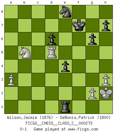 Last move : 0-1 2020 May 12 17:57:0 [Event "FICGS__CHESS__CLASS_C__000273"] [Site "FICGS"] [Date "2019.10.11"] [Round "1"] [White "Wilson,Jaimie"] [Black "DeBonis,Patrick"] [Result "0-1"] [WhiteElo "1876"] [BlackElo "1800"] 1.e4 c5 2.Nf3 d6 3.Bb5+ Bd7 4.Bxd7+ Nxd7 5.O-O Ngf6 6.Qe2 a6 7.b3 g6 8.Bb2 Bg7 9.d4 cxd4 10.Nxd4 Nc5 11.Nd2 O-O 12.c4 Bh6 13.Rad1 e5 14.Nc2 b5 15.f3 Rc8 16.Kh1 Qa5 17.a3 Qb6 18.cxb5 Qxb5 19.Qxb5 axb5 20.Nb4 Rfd8 21.Rfe1 Bxd2 22.Rxd2 Nxb3 23.Rd3 Nc5 24.Rd2 Na4 25.Red1 Nxb2 26.Rxb2 Rc3 27.h3 Rd7 28.Rbd2 Ne8 29.Rd3 Rxd3 30.Rxd3 f5 31.Nd5 Ra7 32.Rb3 fxe4 33.fxe4 Ra4 34.Nc3 Rc4 35.Nxb5 Rxe4 36.Rd3 Re1+ 37.Kh2 e4 38.Rd5 Kf7 0-1 Sicilian : Canal-Sokolsky attack, 3...Bd7 Kingside Castling by player White (move 5) Kingside Castling by player Black (move 11) Player Black won this chess game. Follow this game move after move (download)Only the player with the initiative has the right to attack. (Wilhelm Steinitz) Der Bart als Geschlechtszeichen mitten im Gesicht ist obszön. Daher gefällt er den Weibern. [Zugegeben, kein Schachzitat, aber unglaublich originell] (Arthur Schopenhauer) La táctica fluye a partir de una posición superior. (Bobby Fischer) Ne tendez aucun piège pour le plaisir ! Ne jouez rien dans l'espoir que l'adversaire réagisse de façon stupide ! Prenez toujours pour acquis que l'adversaire va trouver le meilleur coup ! Ne jouez jamais de coup dans l'espoir que l'adversaire ne voie pas la menace ! Chacun de vos coups doit améliorer la position d'une façon ou d'une autre. Have no fear of perfection - you'll never reach it. (Salvador Dali)