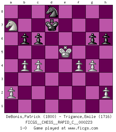 Last move : 1-0 2019 December 31 13:55:20 [Event "FICGS__CHESS__RAPID_C__000223"] [Site "FICGS"] [Date "2019.10.11"] [Round "1"] [White "DeBonis,Patrick"] [Black "Trigance,Emile"] [Result "1-0"] [WhiteElo "1800"] [BlackElo "1716"] 1.d4 Nf6 2.c4 d6 3.Nc3 e5 4.Nf3 Nbd7 5.e4 Be7 6.Be2 O-O 7.O-O h6 8.Qc2 Nh7 9.dxe5 Nxe5 10.Nxe5 dxe5 11.Rd1 Bd7 12.Bg4 Nf6 13.Bxd7 Nxd7 14.Qe2 Qe8 15.Qg4 Nf6 16.Qg3 Kh8 17.Qxe5 Bd6 18.Qxe8 Rfxe8 19.f3 Bc5+ 20.Kf1 c6 21.Ke2 Rad8 22.Rxd8 Rxd8 23.Be3 Bxe3 24.Kxe3 Kg8 25.e5 Ne8 26.Rd1 Rxd1 27.Nxd1 Nc7 28.Nc3 Ne6 29.Ne4 Kf8 30.Nd6 Nd8 31.f4 b6 32.b4 Ke7 33.Ke4 g6 34.g4 f6 35.Nc8+ Kd7 36.Nxa7 fxe5 37.Kxe5 1-0 Old Indian : Main line Kingside Castling by player Black (move 6) Kingside Castling by player White (move 7) Player White won this chess game. Follow this game move after move (download)No one ever won a game by resigning. (Unknown) Es ist nicht das erste mal, dass sich die FIDE dem Arabischen Geld gebeugt hat (über die FIDE WM 2004 in Lybien). (Larry Evans) Las ideas audaces son como las piezas del Ajedrez que avanzan hacia adelante. Ellas pueden ser vencidas, pero también pueden iniciar una partida victoriosa. (Goethe) Les sacrifices démontrent seulement que quelqu'un a gaffé. (Savielly Tartacover) If you ain't just a little scared when you enter a casino, you are either very rich or you haven't studied the games enough. (Pappy)
