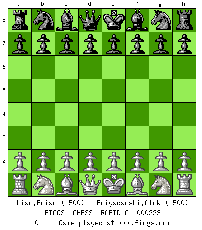 Last move : 0-1 2019 November 11 4:0:28 [Event "FICGS__CHESS__RAPID_C__000223"] [Site "FICGS"] [Date "2019.10.11"] [Round "1"] [White "Lian,Brian"] [Black "Priyadarshi,Alok"] [Result "0-1"] [WhiteElo "1500"] [BlackElo "1500"] 0-1 This chess game has been lost on time (started : 2019.10.11 21:51:9) Player Black won this chess game. Follow this game move after move (download)Look at Garry Kasparov. After he loses, invariably he wins the next game. He just kills the next guy. That's something that we have to learn to be able to do. (Maurice Ashley) Ich könnte leicht behaupten: Ja,ja, Leonid Breschnew wollte nicht, daß ich Weltmeister werde. In der Tat war die Sache komplizierter. (Viktor Kortschnoi) El Ajedrez no es como la vida... ¡tiene reglas!. (Mark Pasternak) Des combinaisons [dans le jeu d'échecs] pareilles à des mélodies. Je crois entendre pour ainsi dire la musique des coups... (Vladimir Nabokov) Gambling is the son of avarice and the father of despair. (French proverb)