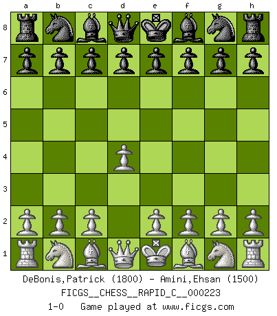 Last move : 1-0 2019 November 11 4:0:28 [Event "FICGS__CHESS__RAPID_C__000223"] [Site "FICGS"] [Date "2019.10.11"] [Round "1"] [White "DeBonis,Patrick"] [Black "Amini,Ehsan"] [Result "1-0"] [WhiteElo "1800"] [BlackElo "1500"] 1.d4 1-0 This chess game has been lost on time (started : 2019.10.11 21:51:9) Queen's pawn Player White won this chess game. Follow this game move after move (download)We must make sure that Chess will not be like a dead language, very interesting, but for a very small group. (Sytze Faber) Eine Person mit durchschnittlichem IQ kann etwa eine ELO von 2000 erreichen. (Jonathan Levitt) Un sacrificio se refuta mucho mejor al aceptarlo. (Wilhelm Steinitz) Aux échecs, les retours au sommet sont rares : les dommages psychologiques consécutifs à une défaite sont trop sévères. (Daily Telegraph) Live, lose, and learn, by observing your opponent how to win. (Amber Steenbock)