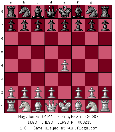 Last move : 1-0 2019 November 22 13:36:23 [Event "FICGS__CHESS__CLASS_A__000219"] [Site "FICGS"] [Date "2019.10.13"] [Round "1"] [White "Mag,James"] [Black "Yes,Pavlo"] [Result "1-0"] [WhiteElo "2141"] [BlackElo "2000"] 1.e4 1-0 This chess game has been lost on time (started : 2019.10.13 4:54:52) King's pawn Opening Player White won this chess game. Follow this game move after move (download)Chess books should be used as we use glasses: to assist the sight, although some players make use of them as if they thought they conferred sight. (Jose Raul Capablanca) Wenn sie aufgeben, dann danke ich Ihnen für das Spiel (Eventualzug beim Fernschach). (Anonymous) El Ajedrez no es como la vida... ¡tiene reglas!. (Mark Pasternak) Les échecs sont plus proches de l'art de l'assassinat que de l'art de la guerre. (Arturo Perez-Reverte) Knowledge will give you power, but character respect. (Bruce Lee)