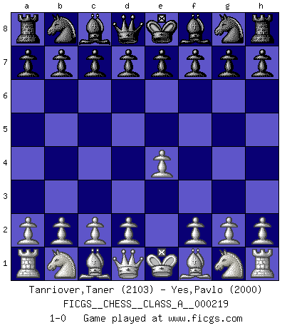 Last move : 1-0 2019 November 22 13:36:23 [Event "FICGS__CHESS__CLASS_A__000219"] [Site "FICGS"] [Date "2019.10.13"] [Round "1"] [White "Tanriover,Taner"] [Black "Yes,Pavlo"] [Result "1-0"] [WhiteElo "2103"] [BlackElo "2000"] 1.e4 1-0 This chess game has been lost on time (started : 2019.10.13 4:54:52) King's pawn Opening Player White won this chess game. Follow this game move after move (download)A Chess game is a dialogue, a conversation between a player and his opponent. Each move by the opponent may contain threats or be a blunder, but a player cannot defend against threats or take advantage of blunders if he does not first ask himself: What is my opponent planning after each move ? (Bruce A. Moon) Ich bin der einzige Schachspieler, der sich während der Vorbereitungen zum Turnier verletzt hat. (Woody Allen) Nada excita más a Grandes Maestros aburridos que una novedad teórica. (Dominic Lawson) Le succès, c'est être capable d'aller d'échec en échec sans perdre son enthousiasme. (Winston Churchill) He is a liar. I just don't know what the lie is yet. (Horatio Caine, C.S.I. Miami)