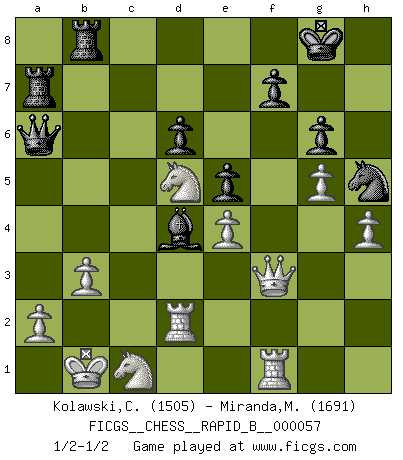Last move : 1/2-1/2 2007 August 21 18:44:3 [Event "FICGS__CHESS__RAPID_B__000057"] [Site "FICGS"] [Date "2007.06.26"] [Round "1"] [White "Kolawski,Christof"] [Black "Miranda,Marcus"] [Result "1/2-1/2"] [WhiteElo "1505"] [BlackElo "1691"] 1.e4 c5 2.Nf3 d6 3.d4 cxd4 4.Nxd4 Nf6 5.Nc3 a6 6.Be3 e5 7.Nb3 Be6 8.f3 Be7 9.Qd2 O-O 10.O-O-O Nbd7 11.g4 Qc7 12.Kb1 Rfc8 13.Qf2 b5 14.g5 Nh5 15.h4 Bd8 16.Bh3 Bxh3 17.Rxh3 b4 18.Nd5 Qb7 19.f4 a5 20.f5 a4 21.Nc1 Nc5 22.Qf3 g6 23.b3 Na6 24.Rf1 Nc5 25.Bxc5 Rxc5 26.Nd3 Rb5 27.Qg4 Qa7 28.N3xb4 axb3 29.cxb3 Qb7 30.fxg6 hxg6 31.Qf3 Ra7 32.Nd3 Qa6 33.Nc1 Bb6 34.Rh2 Bd4 35.Rd2 Rb8 1/2-1/2 Sicilian : Najdorf, Byrne (English) attack Kingside Castling by player Black (move 9) Queenside Castling by player White (move 10) This chess game ended in a draw. Follow this game move after move (download)In order to improve your game, you must study the endgame before everything else, for whereas the endings can be studied and mastered by themselves, the middle game and the opening must be studied in relation to the endgame. (Jose Raul Capablanca) Wenn es im Universum noch irgendwo intelligente Lebewesen gibt, dann kennen sie Go. (Emanuel Lasker) Personalmente, yo prefiero mirar hacia el futuro en donde un programa de computadora gane el título mundial de Ajedrez. La humanidad necesita una lección de humildad. (Richard Dawkings) Il (Jacob Murray) ne joue pas pour le bon coup, mais pour le meilleur. (Eloi Relange) I just play for fun. (Anna Kournikova)