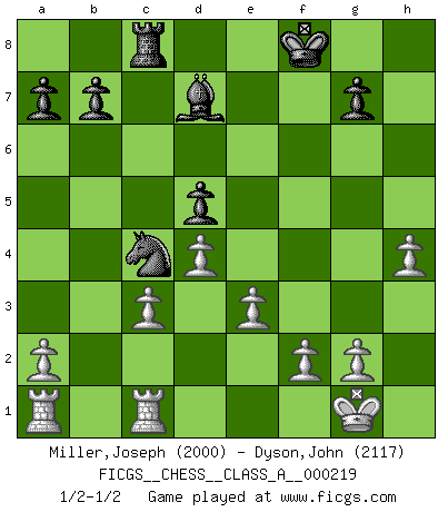 Last move : 1/2-1/2 2020 January 5 14:25:30 [Event "FICGS__CHESS__CLASS_A__000219"] [Site "FICGS"] [Date "2019.10.13"] [Round "1"] [White "Miller,Joseph"] [Black "Dyson,John"] [Result "1/2-1/2"] [WhiteElo "2000"] [BlackElo "2117"] 1.d4 d5 2.c4 c6 3.Nc3 Nf6 4.cxd5 cxd5 5.Bf4 Nc6 6.e3 Bf5 7.Qb3 Na5 8.Qa4+ Bd7 9.Qc2 e6 10.Nf3 Bb4 11.Bd3 Rc8 12.O-O Nh5 13.Bg5 f6 14.Bxh7 Bxc3 15.bxc3 fxg5 16.Qg6+ Kf8 17.Qxh5 Be8 18.Qg4 Rxh7 19.Nxg5 Rh6 20.Nxe6+ Rxe6 21.Qxe6 Qd7 22.Qxd7 Bxd7 23.Rfc1 Nc4 24.h4 1/2-1/2 QGD Slav defense Kingside Castling by player White (move 12) This chess game ended in a draw. Follow this game move after move (download)Fischer sacrificed virtually everything most of us weakies (to use his term) value, respect, and cherish, for the sake of an artful, often beautiful board game, for the ambivalent privilege of being its greatest master. (Paul Kollar) Mit sehr nachdenklichem Gesicht schreitet Bobby durch den Turniersaal. Was ist passiert?, fragt Lombardy. Ich stehe schlecht, antwortet Fischer. Lombardy: Dann biete doch einfach Remis an. Fischer: So schlecht stehe ich nun auch wieder nicht! (Robert James Fischer) Con el tiempo, empecé a progresar en partidas decisivas. Tal vez porque me di cuenta de una simple verdad: no solo estaba yo nervioso sino también mi oponente. (Mikhail Tal) La vie est comme un jeu d'échecs : nous esquissons un plan, mais celui-ci est tributaire de ce que daignent faire l'adversaire aux échecs et le destin dans la vie. (Arthur Schopenhauer) Locking firmely the window serves nothing, only small thiefs pass through there, the big thiefs enter through the front door. (Luc-Olivier Leclerc)
